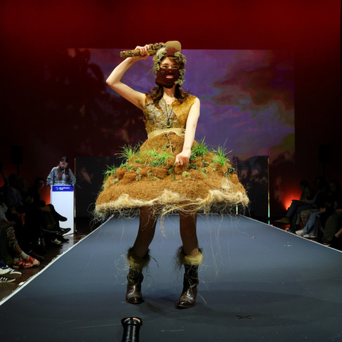 For her entry Ko au te ao, ko te ao au, Scarlett transformed coconut husk, orange peels, seaweed, muka, microgreens and other natural fibres into a striking garment inspired by Te Whare Tapa Whā. Her design explored the cycles of nature and the idea that when the land and sea are well, people thrive. Judges praised the work as “absolute WOW factor”, with courageous creativity, dedicated use of sustainable materials and powerful storytelling woven through every element. Scarlett’s win follows her second placing in the Intermediate category in 2024, marking her out as a young designer with natural talent and one to watch as she develops her artistic voice.